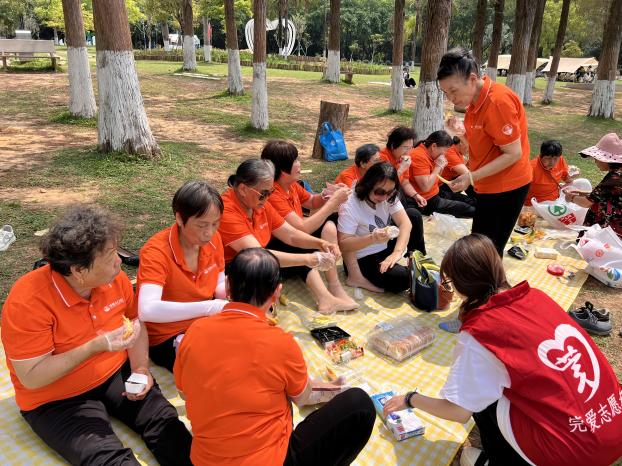 队伍抵达同沙生态园后,在湖畔草坪温馨开展野餐联谊与互动文娱环节。长者们围坐欢聚,共同品尝低糖糕点、时令水果、青团等健康点心。现场精心设置经典老歌猜名、集体合唱、趣味舞蹈等文体互动项目,熟悉的旋律唤醒温暖回忆,不少长者主动参与展示,现场氛围和睦融洽、欢声笑语不断。通过丰富多样的互动交流,进一步增进了长者之间的情谊,营造了温馨和谐、友爱互助的良好氛围。